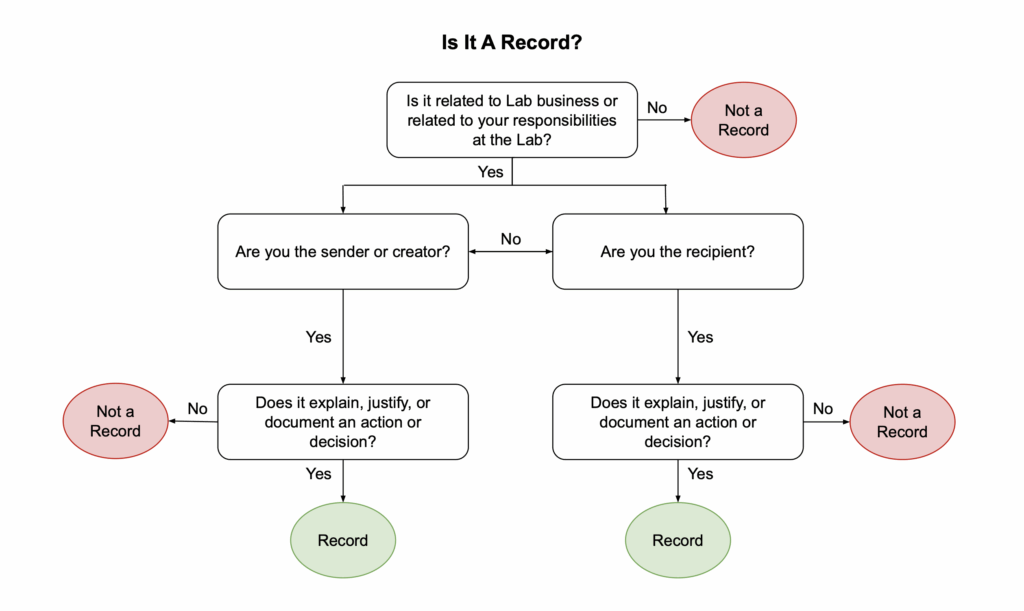 A record is material, in any media, that has been created or received in the course of Laboratory business, and provides evidence of the Lab’s decisions or actions related to a research or operational function. This decision tree below serves as a tool for you to use when making the distinction between a record and a non-record.